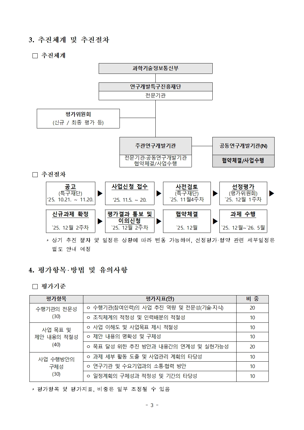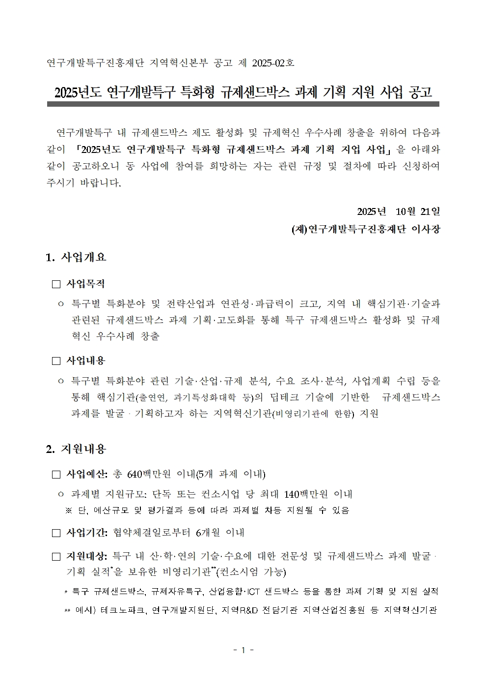 사업공고 사업공고 목록 2025-0035 | 2025년도 연구개발특구 특화형 규제샌드박스 과제 기획 지원 사업 공고 접수기간 2025-11-05 09시 ~ 2025-11-20 15시 공고담당자 지역혁신총괄실 전다혜 조회수 164 첨부파일 첨부 양식, 관련자료 등