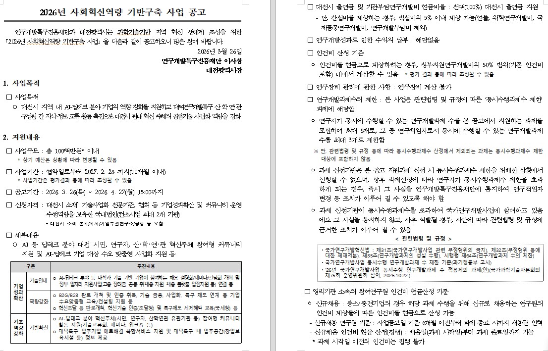 로그인 회원가입 연구소기업 회원가입 사업공고 사업공고 사업공고 연구소기업 연구소기업 연구소기업 소개 등록신청 변경신청 경영현황조사 등록취소신청 첨단기술기업 연구소기업 첨단기술기업 소개 지정(재지정) 신청 변경 지정 신청 지정서 재발급 신청 민원 신청 현황 규제샌드박스 연구소기업 규제샌드박스 소개/안내 규제샌드박스 신청 책임보험 관리 규제샌드박스 변경 신청 현장점검 신청 성과 모니터링 적용 결과보고s 정보마당 정보마당 공지사항 자료실 --> --> --> 평가위원정보 평가위원정보 평가위원 신청 평가위원 정보 현행화 평가이력 조회 기관정보 기관정보 사업체정보 사업체정보이력 제재현황(NTIS제재조치현황포함) 소속인력현황 기관관리자관리 개인정보 개인정보 기본정보 상세정보 개인정보이력 제재현황(NTIS제재조치현황포함) 마이페이지 마이페이지 수행과제현황 과제 신청 평가결과/이의신청 전자협약청 협약정보등록 협약 체결 사업비지급 신청 사업비지급 신청 가상계좌 확인 협약변경 신청 협약변경 신청 연구장비관리 장비도입 관리 장비활용 관리 보고서 제출 성과 제출 성과 등록 사업비 정산 납부계획 정산금 기술료 환수금/제재부가금 기술료납부계획서 기술사업화위원회결과 우수기술발굴 공고목록 접수목록 기술가치평가 지원공고 신청목록 연구소기업 등록신청 변경신청 경영현황조사 등록취소신청 연구개발특구펀드 연구개발특구진흥재단 로그인 회원가입 연구소기업 회원가입 주메뉴 사업공고 연구소기업 연구소기업 소개 등록신청 변경신청 경영현황조사 등록취소신청 첨단기술기업 첨단기술기업 소개 지정(재지정)신청 변경지정신청 지정서 재발급 신청 민원 신청 현황 규제샌드박스 규제샌드박스 소개/안내 규제샌드박스 신청 규제샌드박스 변경 신청 책임보험 관리 현장점검 신청 성과 모니터링 적용 결과보고 정보마당 FAQ 공지사항 자료실 평가위원정보 평가위원신청 평가위원정보현행화 평가이력 조회 기관정보 사업체정보 사업체정보이력 제재현황 개인정보 기본정보 상세정보 개인정보 이력 제재현황 조회 사업공고 사업공고 목록 2026-0007 | [대전시]2026년 공공기술연계 사회문제해결 R&BD 지원사업(사회혁신역량 기반구축) 공고 접수기간 2026-03-26 00시 ~ 2026-04-27 15시 공고담당자 혁신기업지원실 김나리 조회수 39 첨부파일 첨부 양식, 관련자료 등 위로
