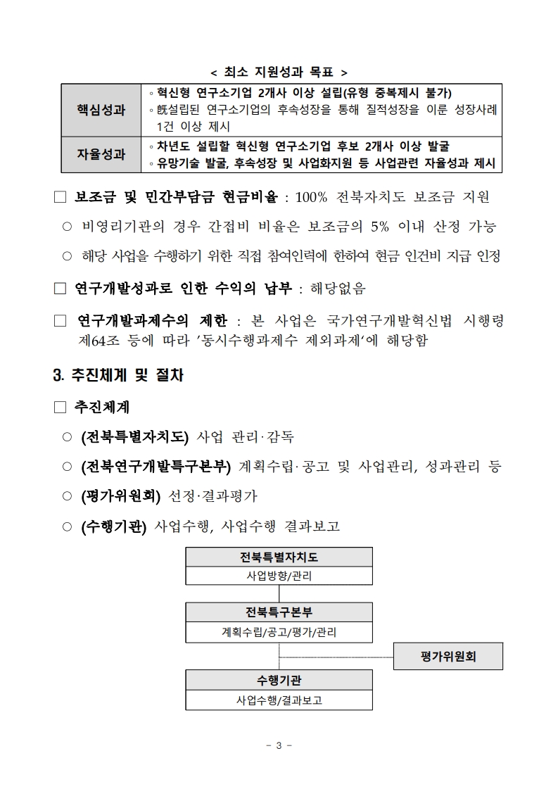 로그인 회원가입 연구소기업 회원가입 사업공고 사업공고 사업공고 연구소기업 연구소기업 연구소기업 소개 등록신청 변경신청 경영현황조사 등록취소신청 첨단기술기업 연구소기업 첨단기술기업 소개 지정(재지정) 신청 변경 지정 신청 지정서 재발급 신청 민원 신청 현황 규제샌드박스 연구소기업 규제샌드박스 소개/안내 규제샌드박스 신청 책임보험 관리 규제샌드박스 변경 신청 현장점검 신청 성과 모니터링 적용 결과보고s 정보마당 정보마당 공지사항 자료실 --> --> --> 평가위원정보 평가위원정보 평가위원 신청 평가위원 정보 현행화 평가이력 조회 기관정보 기관정보 사업체정보 사업체정보이력 제재현황(NTIS제재조치현황포함) 소속인력현황 기관관리자관리 개인정보 개인정보 기본정보 상세정보 개인정보이력 제재현황(NTIS제재조치현황포함) 마이페이지 마이페이지 수행과제현황 과제 신청 평가결과/이의신청 전자협약청 협약정보등록 협약 체결 사업비지급 신청 사업비지급 신청 가상계좌 확인 협약변경 신청 협약변경 신청 연구장비관리 장비도입 관리 장비활용 관리 보고서 제출 성과 제출 성과 등록 사업비 정산 납부계획 정산금 기술료 환수금/제재부가금 기술료납부계획서 기술사업화위원회결과 우수기술발굴 공고목록 접수목록 기술가치평가 지원공고 신청목록 연구소기업 등록신청 변경신청 경영현황조사 등록취소신청 연구개발특구펀드 연구개발특구진흥재단 로그인 회원가입 연구소기업 회원가입 주메뉴 사업공고 연구소기업 연구소기업 소개 등록신청 변경신청 경영현황조사 등록취소신청 첨단기술기업 첨단기술기업 소개 지정(재지정)신청 변경지정신청 지정서 재발급 신청 민원 신청 현황 규제샌드박스 규제샌드박스 소개/안내 규제샌드박스 신청 규제샌드박스 변경 신청 책임보험 관리 현장점검 신청 성과 모니터링 적용 결과보고 정보마당 FAQ 공지사항 자료실 평가위원정보 평가위원신청 평가위원정보현행화 평가이력 조회 기관정보 사업체정보 사업체정보이력 제재현황 개인정보 기본정보 상세정보 개인정보 이력 제재현황 조회 사업공고 사업공고 목록 2026-0010 | [전북] 2026년 전북특구 혁신형 연구소기업 기획 및 육성 접수기간 2026-05-11 00시 ~ 2026-05-27 15시 공고담당자 기술사업화팀 김진아 조회수 7 첨부파일 첨부 양식, 관련자료 등 위로